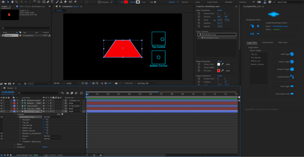 Shapeshifter is a tool for making blendshapes in after effects in a similar fashion to how its done in 3d packages, making copies of the base, default shape and adjusting those copies to make targets. As many targets as you like can be added.